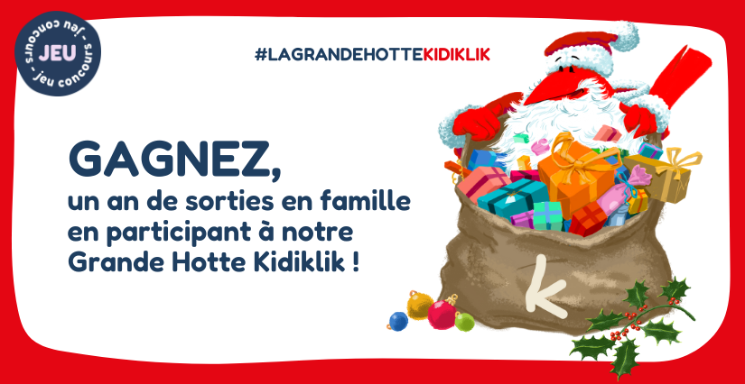 Par ici la magie de Noël avec Kidiklik ! En participant à notre jeu concours "la hotte Kidiklik", tentez de remporter vos sorties en famille pour 2026. À chaque saison, il y a des pépites à découvrir et la hotte de Noël de Kidiklik en est remplie ! Les cadeaux se dévoileront au fur et à mesure des semaines...