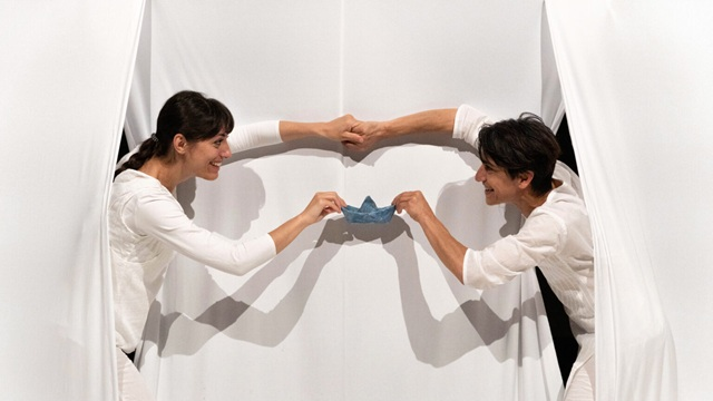 LàQua est une courte chanson qui résonne dans le ventre d'une mère. C'est le son du premier élément qui guide, protège et berce la vie intra-utérine. Dans un espace entièrement blanc, deux…